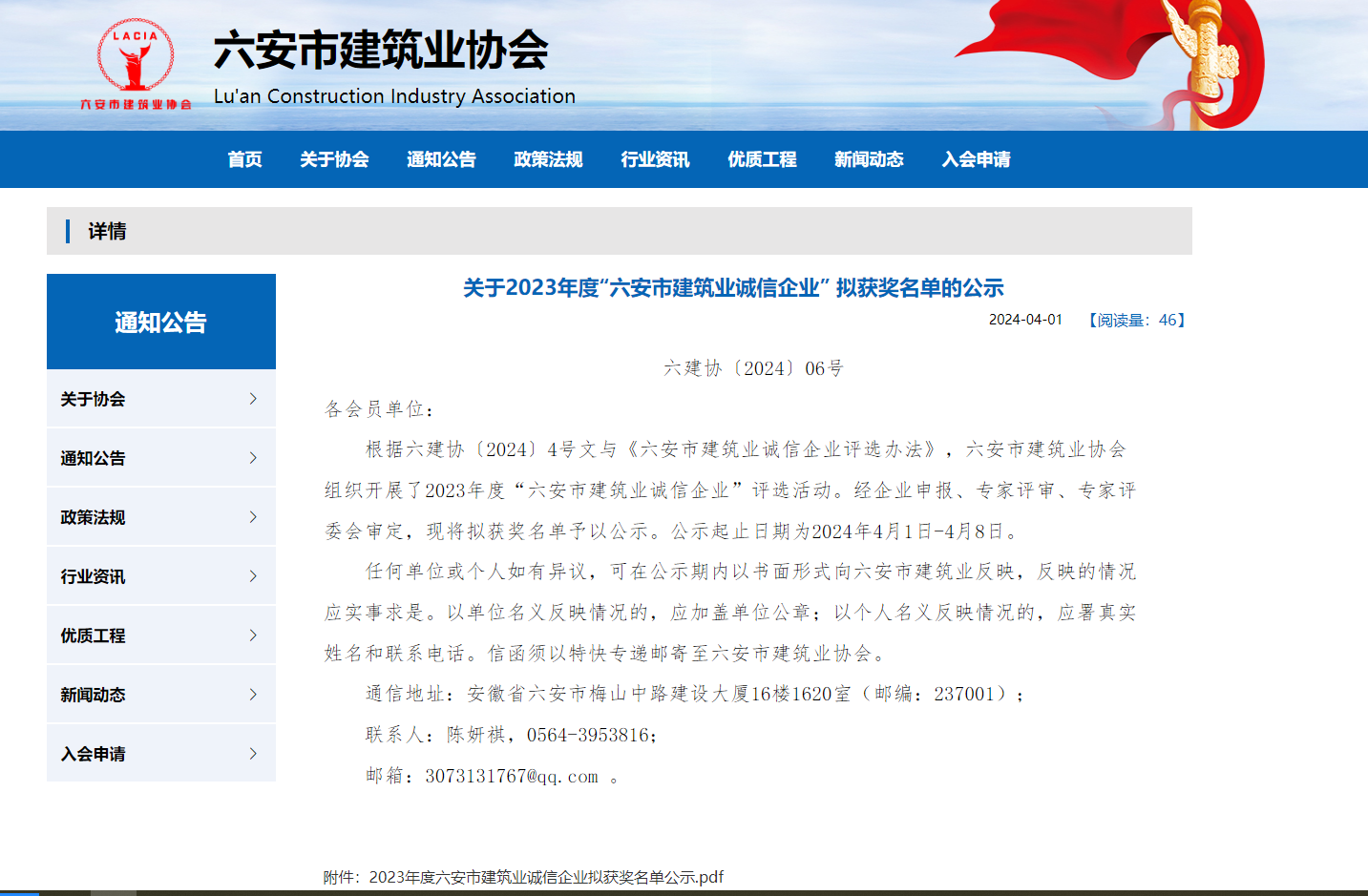 2023年度六安市建筑業(yè)誠信企業(yè)擬獲獎(jiǎng)名單公示