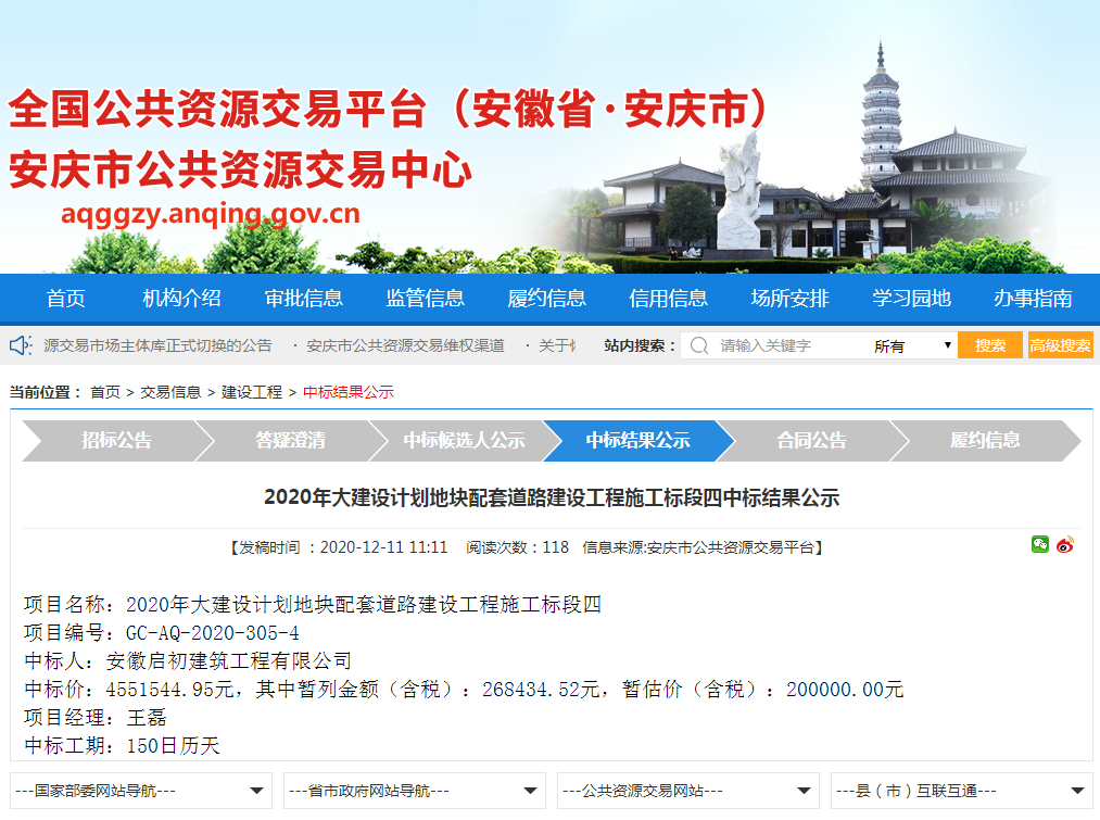 2020年大建設(shè)計劃地塊配套道路建設(shè)工程施工標(biāo)段四中標(biāo)結(jié)果公示