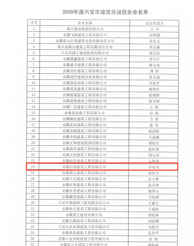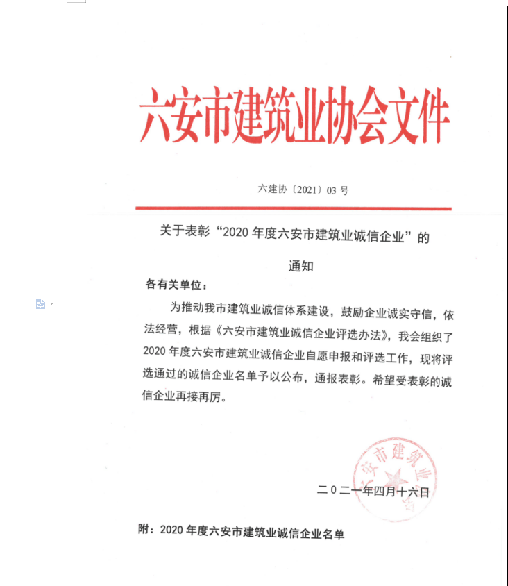 熱烈祝賀安徽啟初建筑公司榮獲:2020年度六安市建筑業(yè)誠信企業(yè)