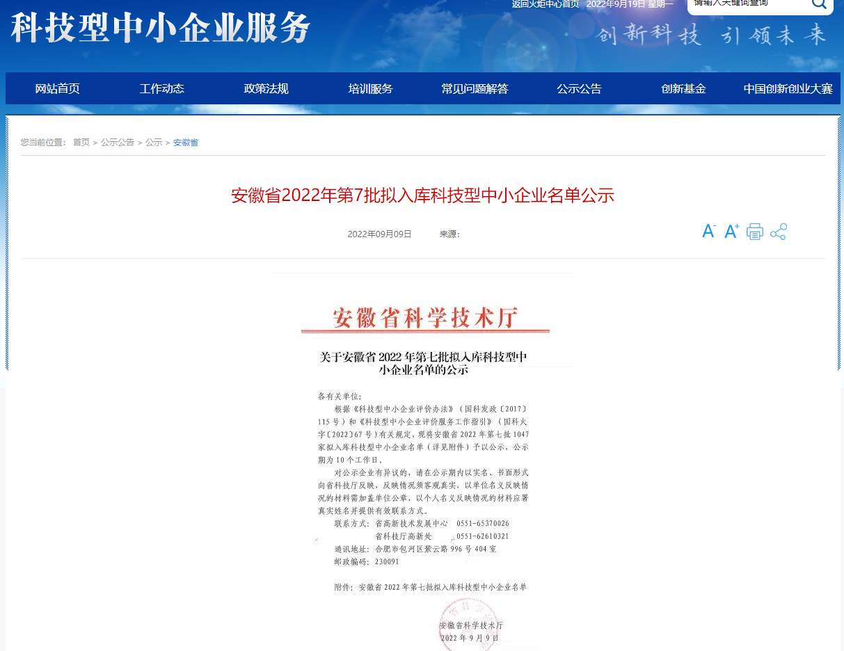 公司榮獲安徽省2022年第七批擬入庫科技型中小企業(yè)