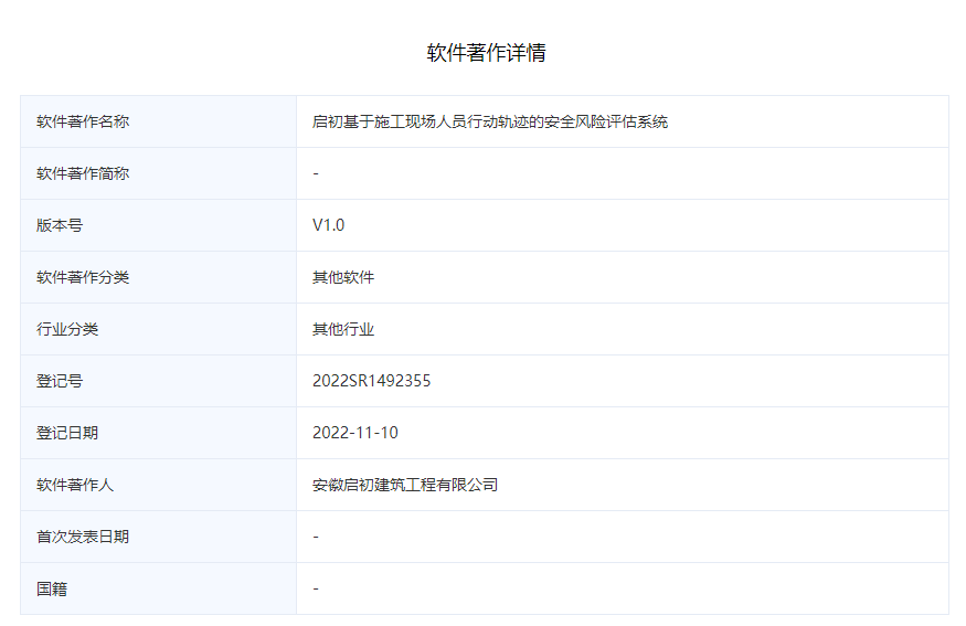 公司獲得軟件著作權(quán)-名稱:啟初基于施工現(xiàn)場人員行動軌跡的安全風(fēng)險評估系統(tǒng)