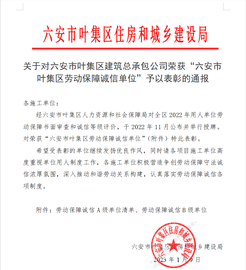 關于對六安市葉集區(qū)建筑公司榮獲“六安市葉集區(qū)勞動保障誠信單位”予以表彰的通報